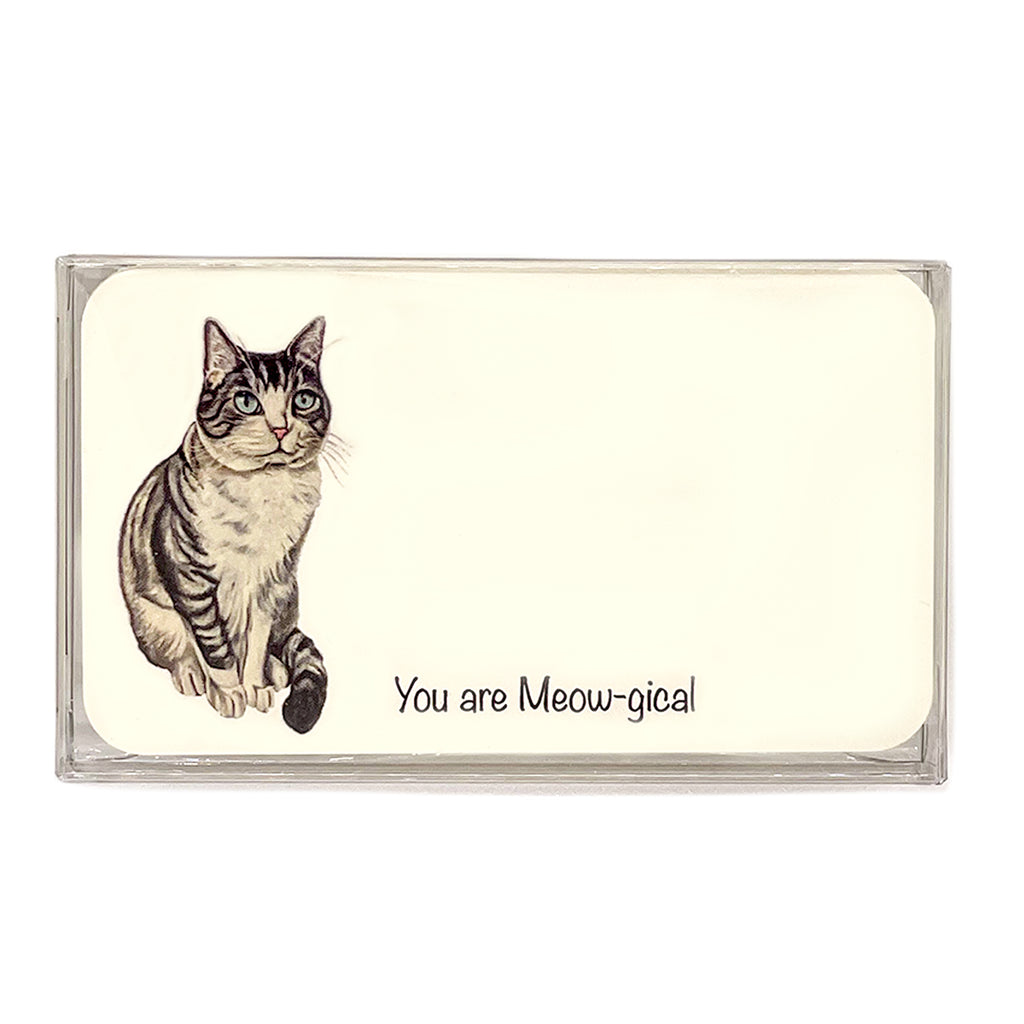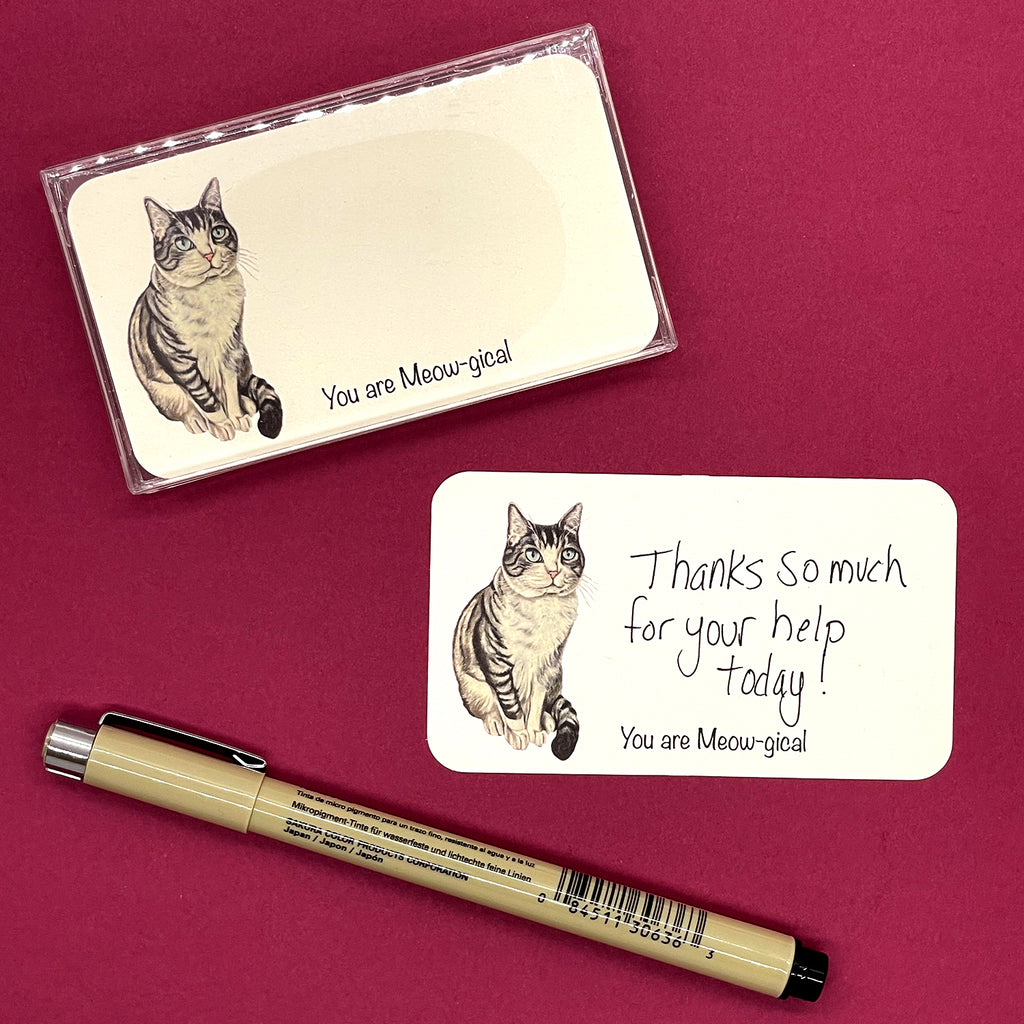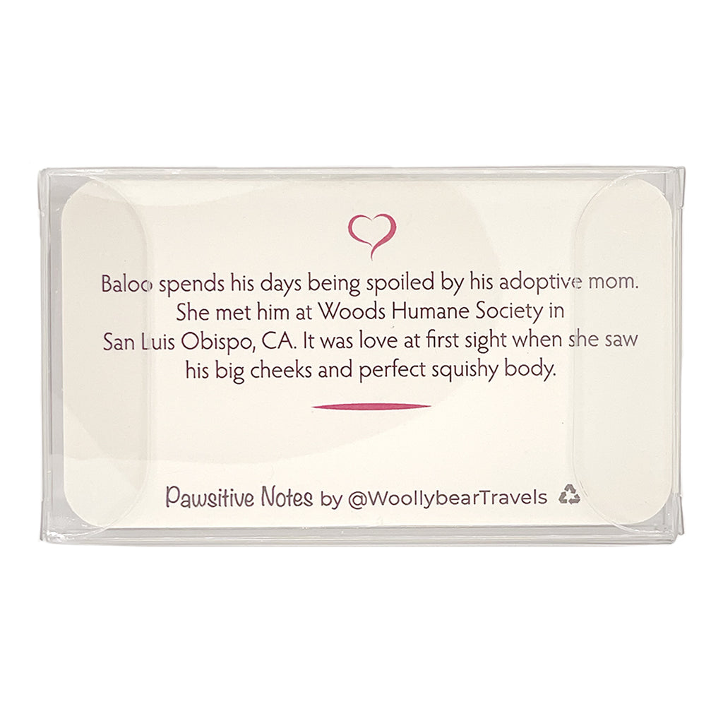 Pawsitive Notes come in a pack of 25 identical cards. They are printed on natural, uncoated paper that is 2" x 3.5" and packaged in a small plastic box so you can take them with you wherever you go!