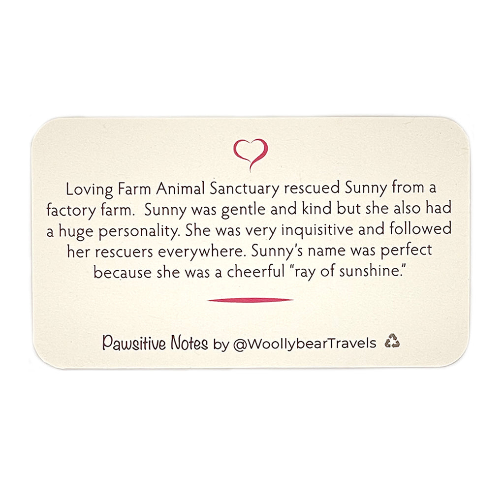 The notes feature rescued animals that I have met, and a small version of their story is on the back of the card. 10% of sales go to the organization that rescued the animal. The featured animals are all my friends and are all very much loved.