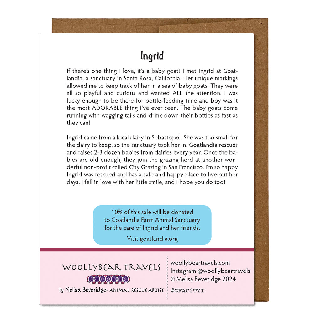 10% of this sale will be donated to Goatlandia for the care of Ingrid and her friends. By purchasing my products you are not only supporting me to do more of this work helping animals, you are also supporting the sanctuary and all of the animals that live there!
