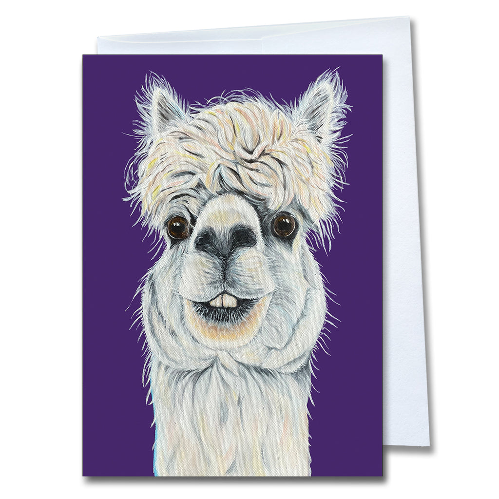 This 5" x 7" blank greeting card with envelope features Al the Alpaca from the Turtle and Tortoise Rescue of Arroyo Grande.