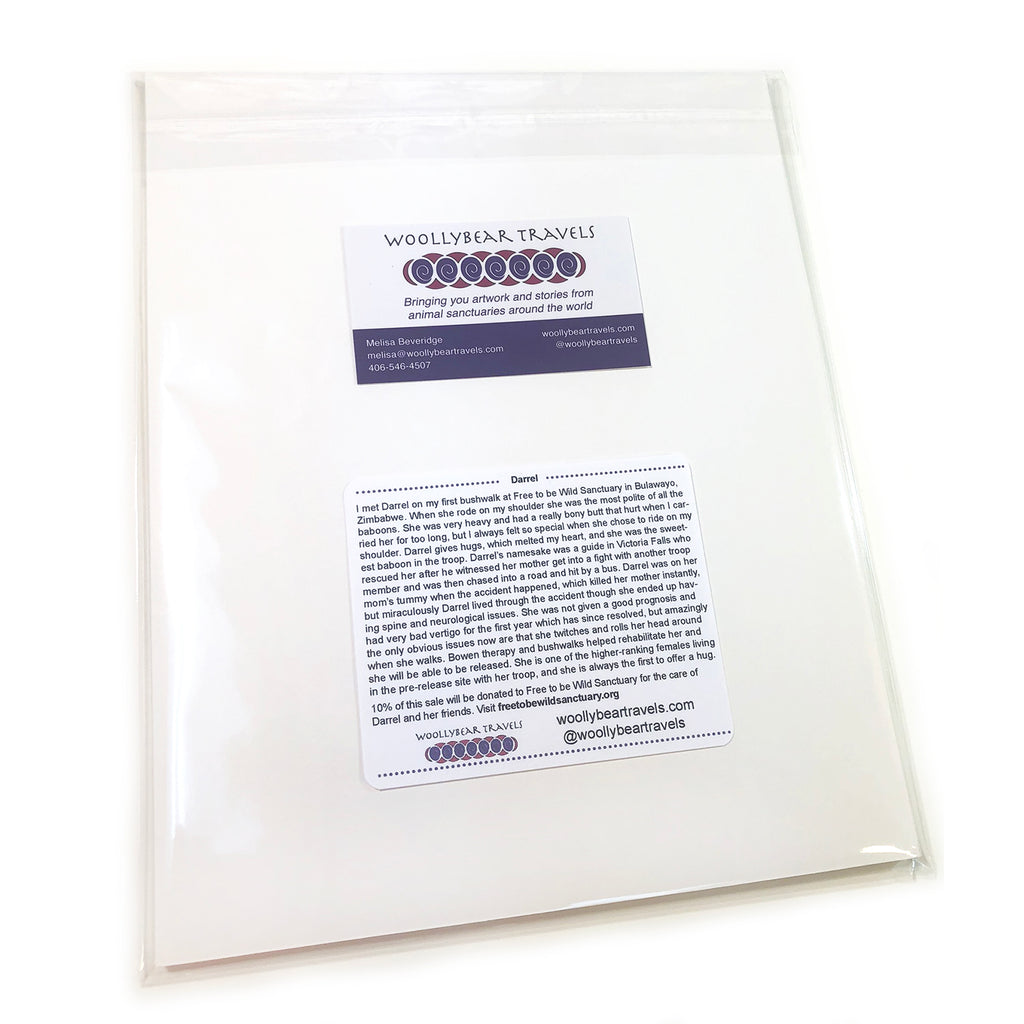 10% of this sale goes back to Free to be Wild Sanctuary in Zimbabwe to help provide all the love and care that Darrel and her friends need. By purchasing my products you are not only supporting me to do more of this work helping animals, you are also supporting the sanctuary and Darrel!