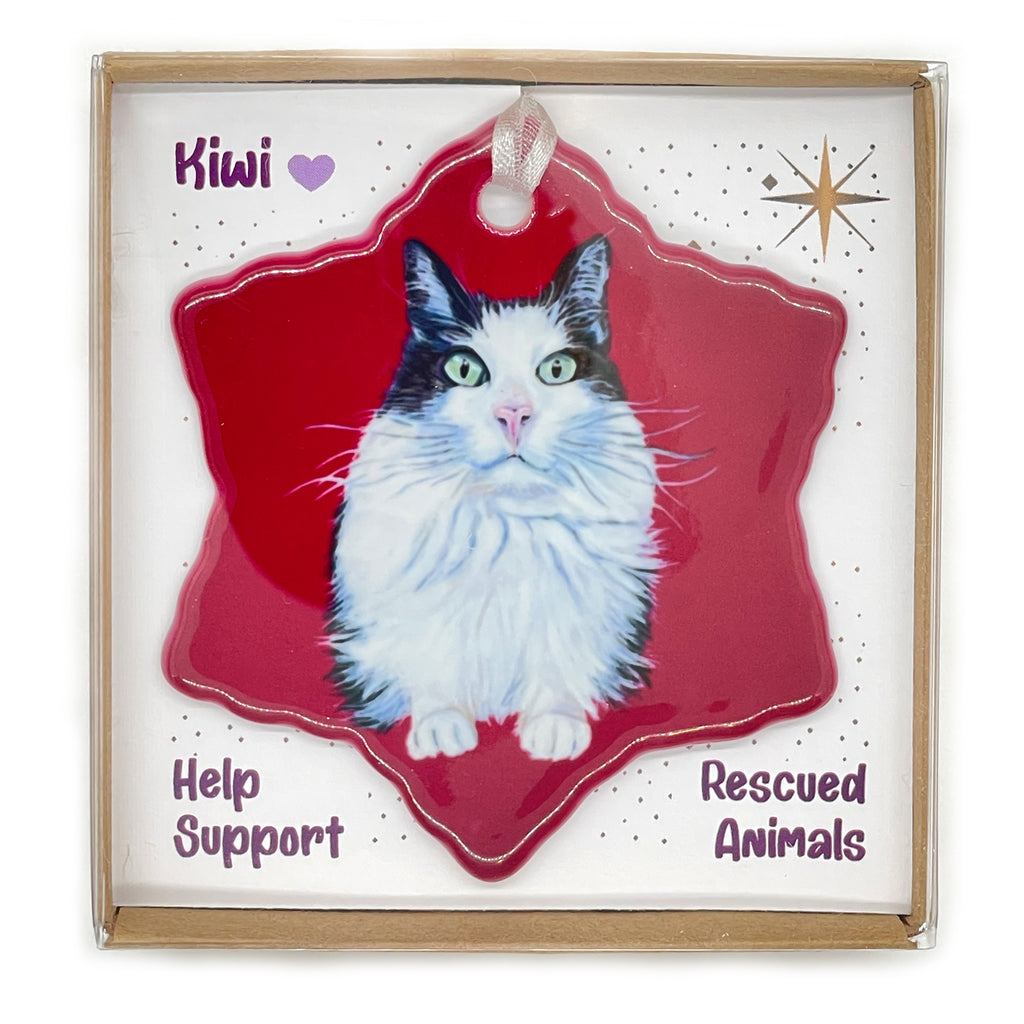 This red ceramic snowflake-shaped ornament will surely add some happiness to your tree and make everyone smile. The 3" ornament features Kiwi the cat from the Cal Poly Cat Program in San Luis Obispo, CA. He is a little prince and very well-loved.