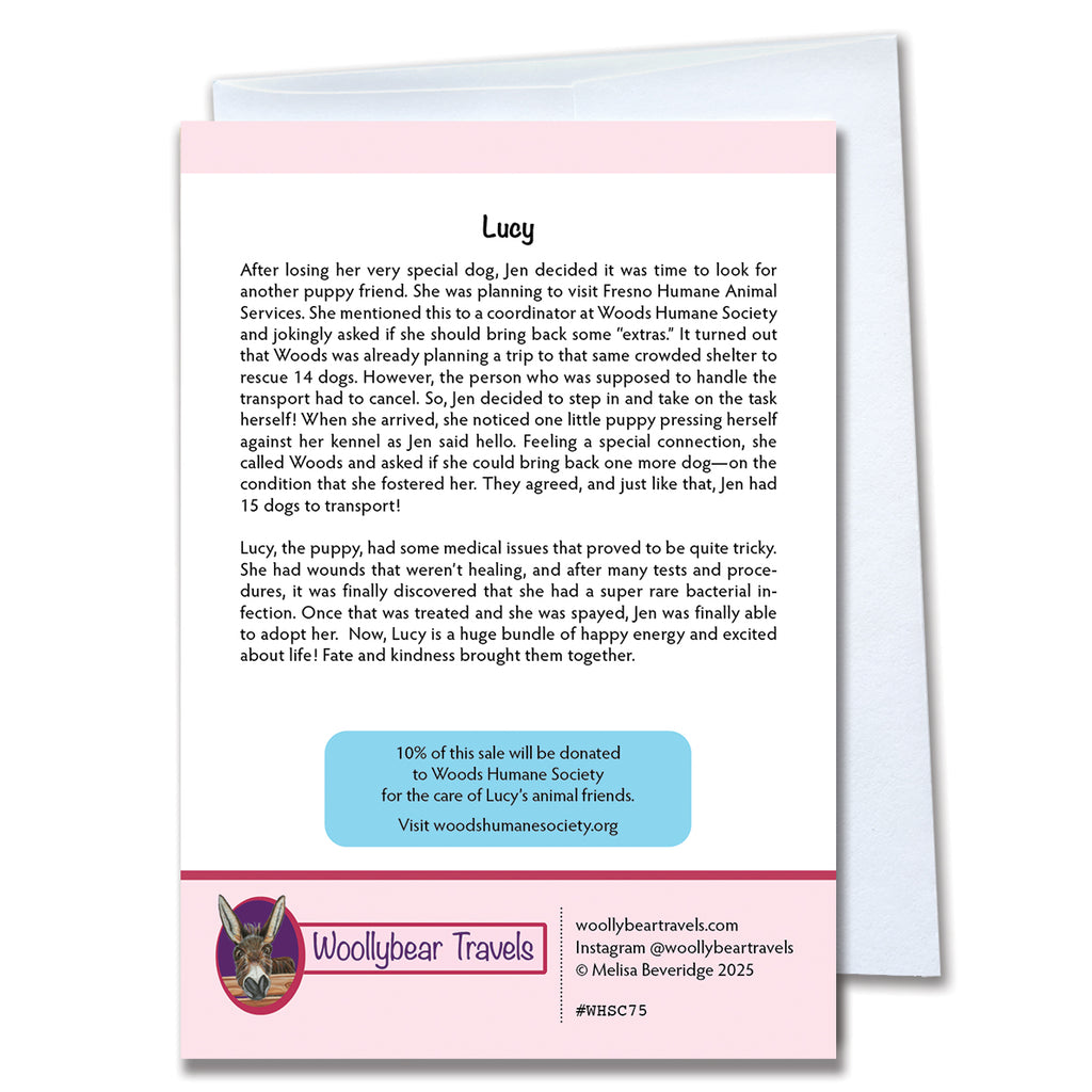This 5" x 7" blank greeting card with envelope features Lucy from Woods Humane Society. Her special story is printed on the back of the card so you can learn a bit more about her and her amazing personality.