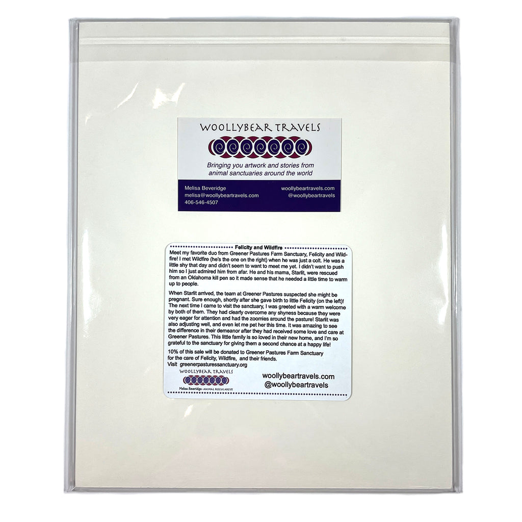 This 8” x 10” signed print is packaged in a plastic sleeve and sent with a sturdy backing. The story of Felicity and Wildfire is written on the back so you can get to know more about their precious personality and back story.
