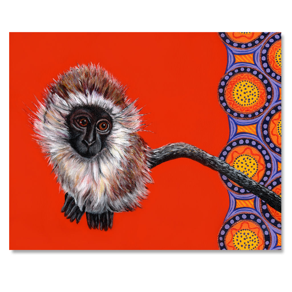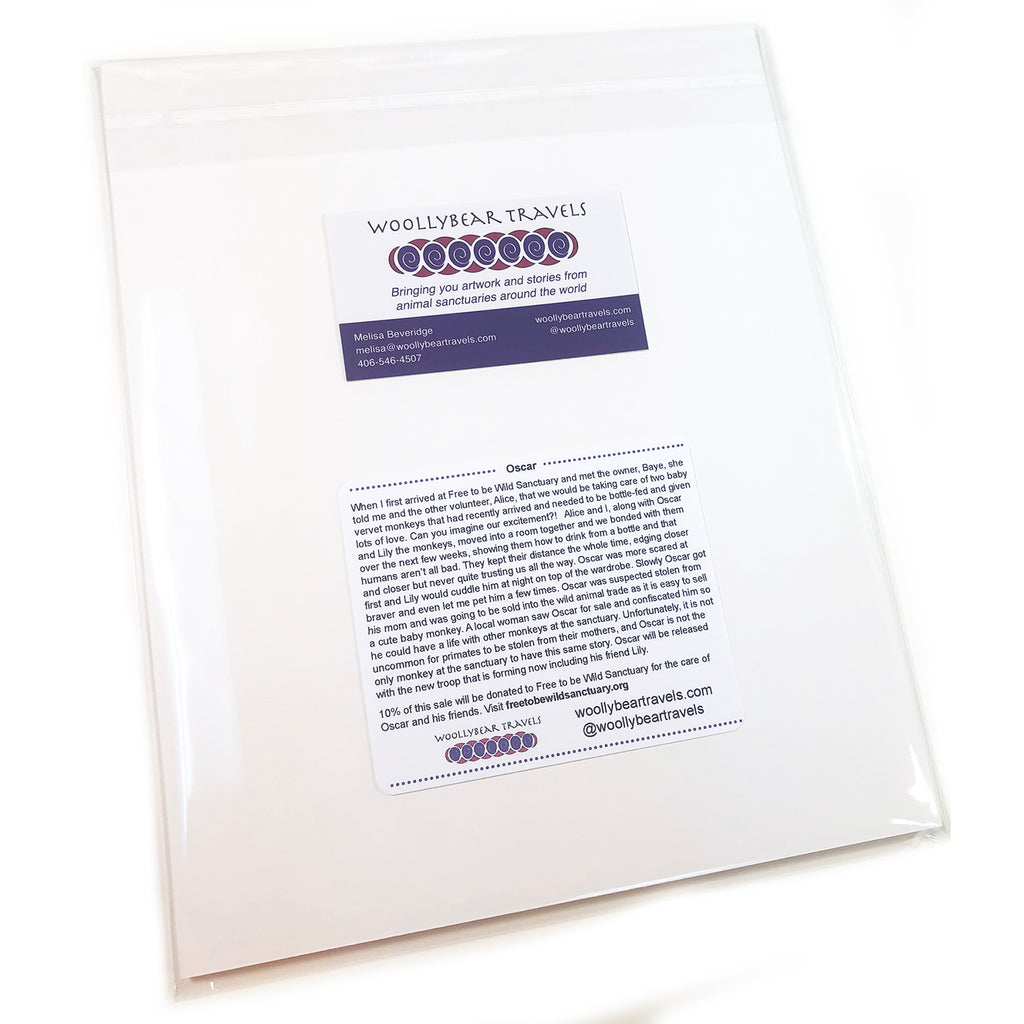 This little bitty baby vervet monkey lives in a troop at Free to be Wild Sanctuary in Zimbabwe. He lived in my bedroom for a few weeks as I showed him how to drink from a bottle which was the most amazing experience ever. The design in the background was inspired by local African fabrics. Read more about Oscar below.
