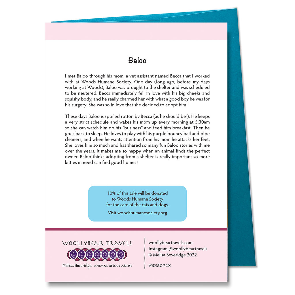 This 5" x 7" blank greeting card with a teal envelope features Baloo! He is a very special cat that my friend got from Woods Humane Society. His special story is printed on the back of the card so you can learn a bit more about him and his super precious personality!