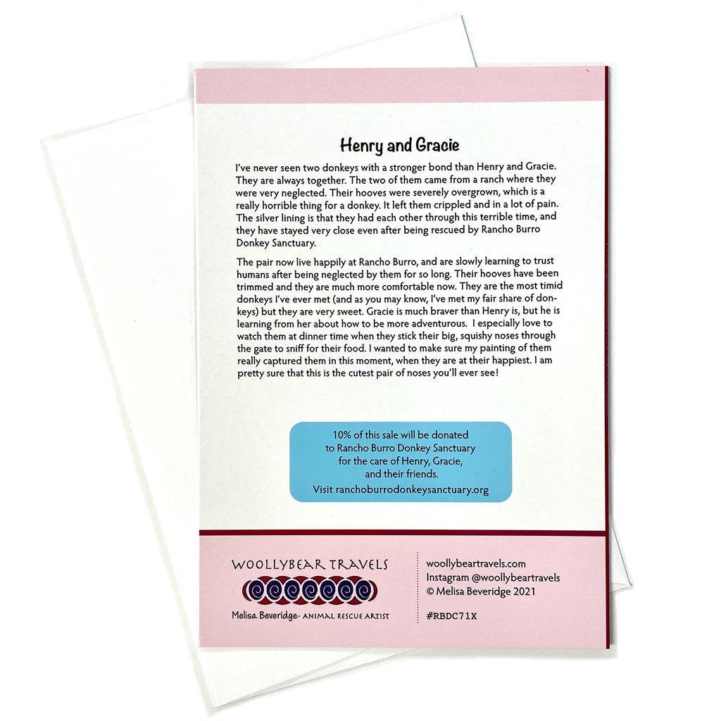 10% of this sale will be donated to Rancho Burro Donkey Sanctuary for the care of Henry, Gracie, and their friends. By purchasing my products you are not only supporting me to do more of this work helping animals, you are also supporting the sanctuary and all of the animals that live there!