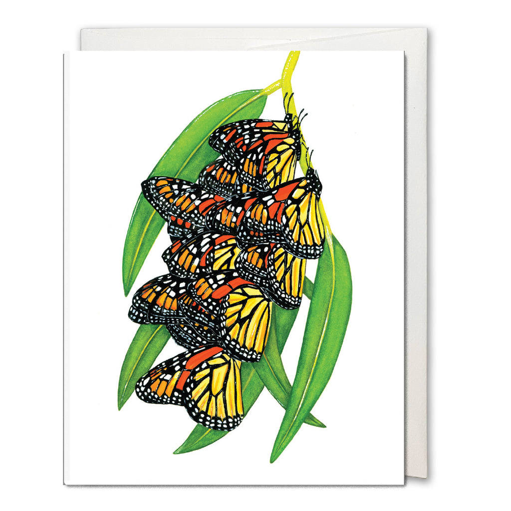 This 4.25" x 5.5" (A2 size) greeting card with a white square flap envelope is blank inside. It features the amazing phenomenon of hundreds of Monarch butterflies clumping together to keep warm while they are migrating. There is a beautiful Eucalyptus grove in Pismo Beach, CA that I visit every year during migration to see this happening.
