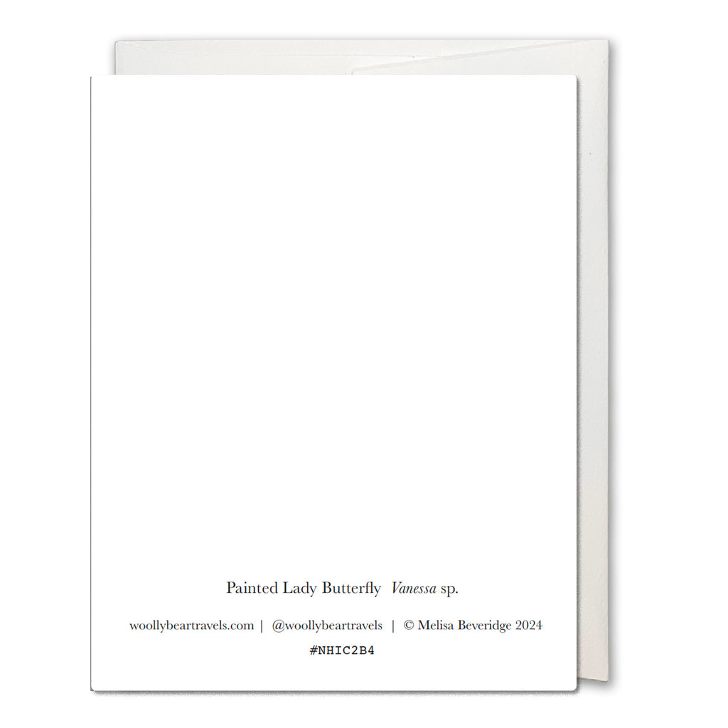 This 4.25" x 5.5" (A2 size) greeting card with a white square flap envelope is blank inside. It features the lovely Painted Lady Butterfly.