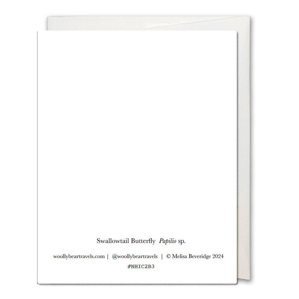 This 4.25" x 5.5" (A2 size)  greeting card with a white square flap envelope is blank inside. It features a Swallowtail butterfly feeding on a pink flower. You can use it for any occasion!