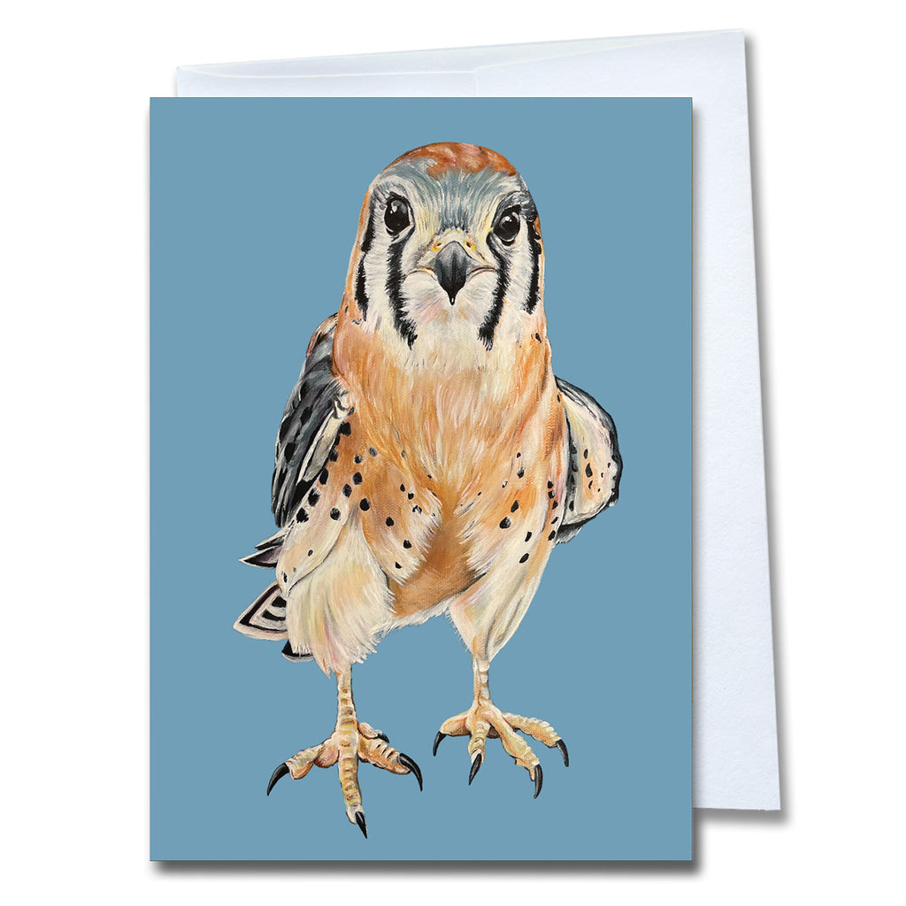 This 5" x 7" blank greeting card with envelope features Pip the American Kestrel from Pacific Wildlife Care.